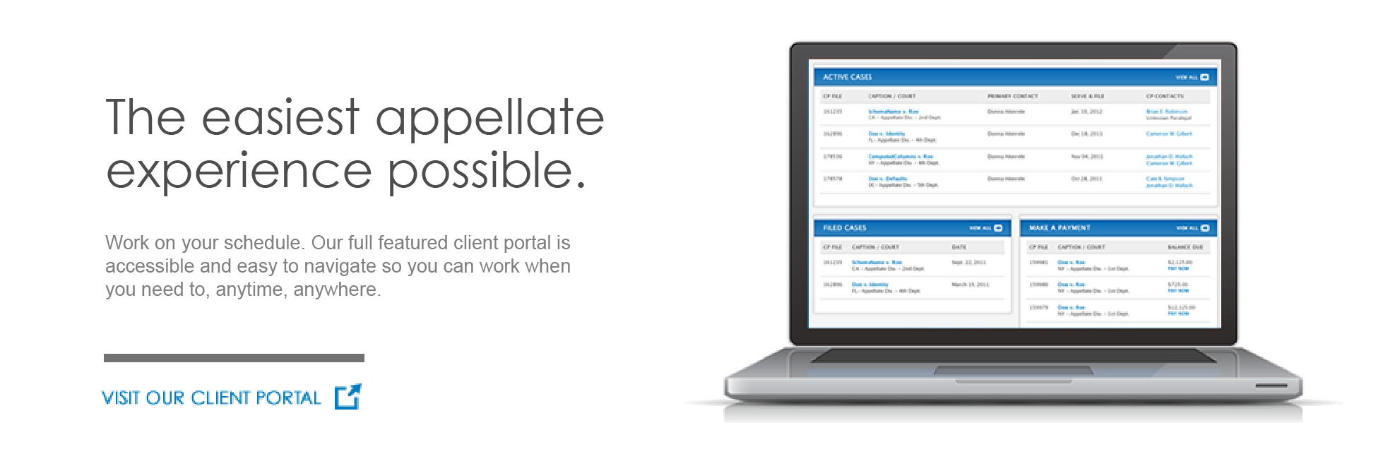 Watch a short video introducing and highlighting the services our clients rely on us to provide each day in courts from coast to coast. We are available to assist you, whether filing an appeal in the United States Supreme Court, any of the 13 U.S. Federal Circuit Courts, or any State Appellate Court or Appellate Division.